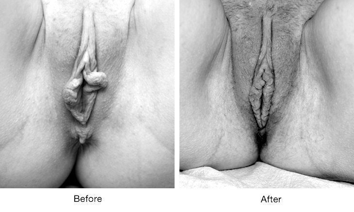 Before and after images of labiaplasty surgery showing vaginal appearance changes.